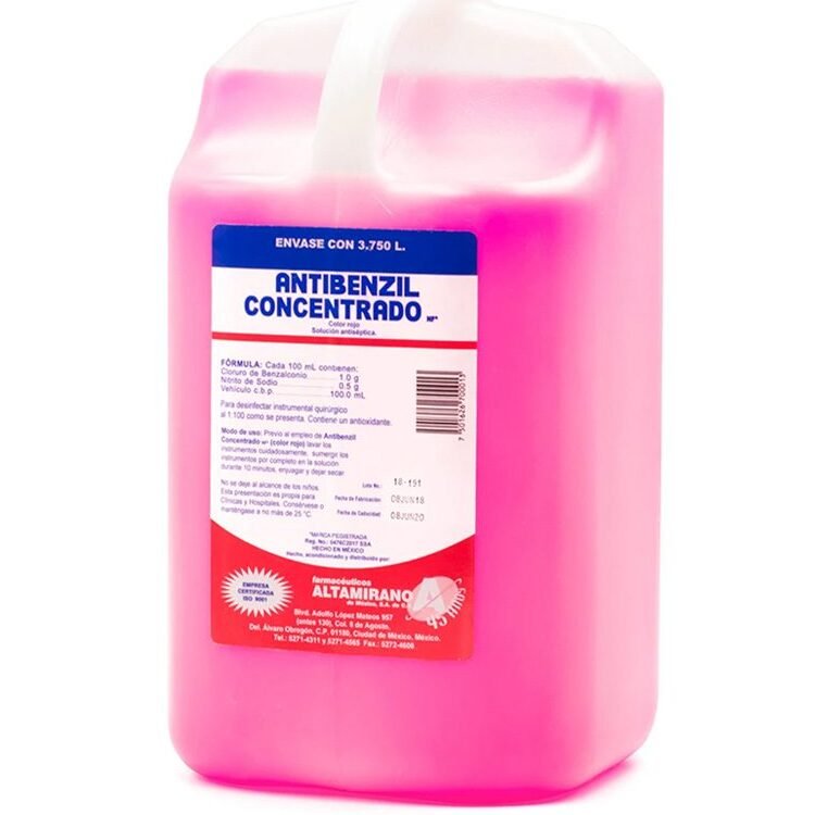 Antibenzil concentrado rojo 3.750L 4 piezas. Desinfectante que actúa sobre una gran variedad de bacterias, principalmente en instrumentos de hule, plástico, acero y vidrio, ya que tiene un alto poder germicida, se usa para desinfección de instrumental quirúrgico y áreas hospitalarias.
