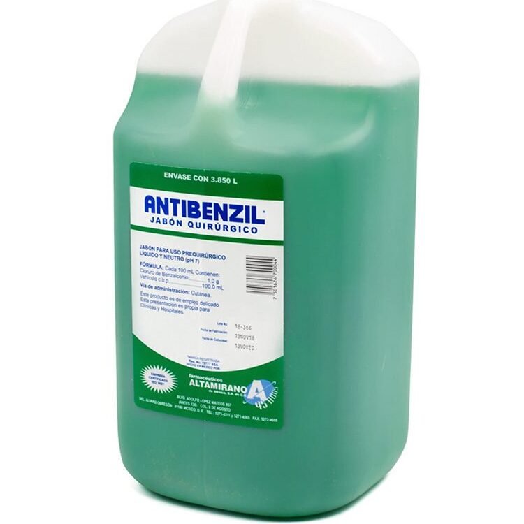 Antibenzil ALTAMIRANO jabón quirúrgico verde – galón 3.85L – 3 piezas. Actúa sobre una gran variedad de bacterias, es ideal no solo para asepsia y lavado pre-quirúrgico de manos y zonas pre-operatorias, sino también para el lavado y pre-desinfección del instrumental quirúrgico, su composición no irrita ni reseca la piel.