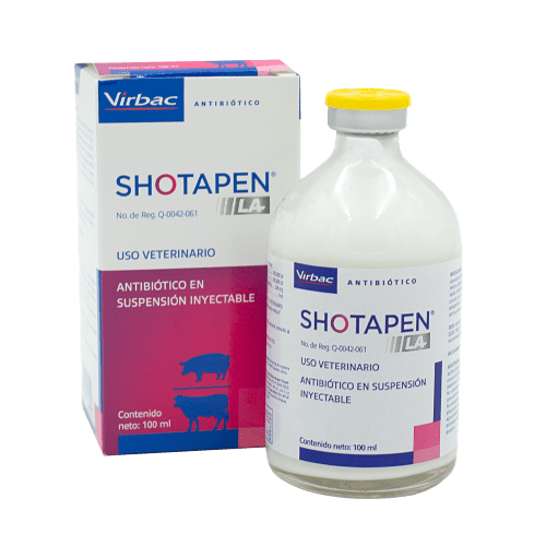 Antibiótico SHOTAPEN L.A. FCO 100 ml, Virbac 2 piezas. Para el tratamiento de procesos infecciosos causados por neumonías bacterianas, síndrome MMA (mastitis, metritis, agalactia), infecciones puerperales, clostridiasis, erisipela, heridas infectadas, tratamiento postoperatorio y enfermedades causadas por microorganismos sensibles a la penicilina y la estreptomicina, en bovinos, porcinos, ovinos, equinos, caninos y felinos.