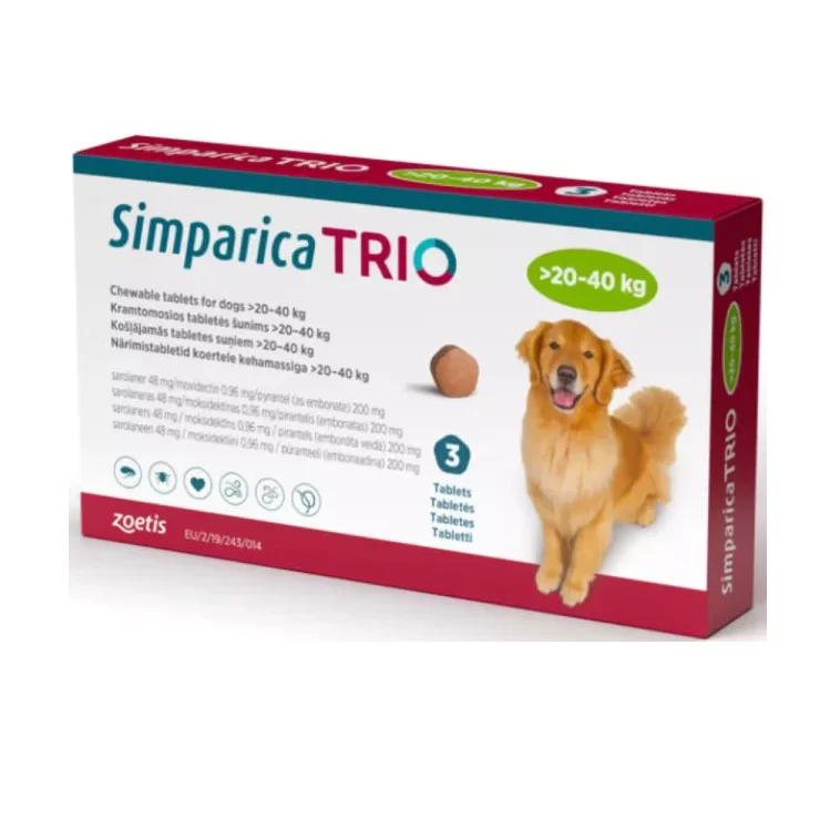 Simparica TRIO verde 20.1-40 kgs – 3 piezas. Tableta masticable mensual que combina sarolaner, moxidectina y pirantel fácil de administrar, protege a su perro contra la dirofilariosis, cinco tipos de garrapatas, pulgas, lombrices intestinales y anquilostomas.